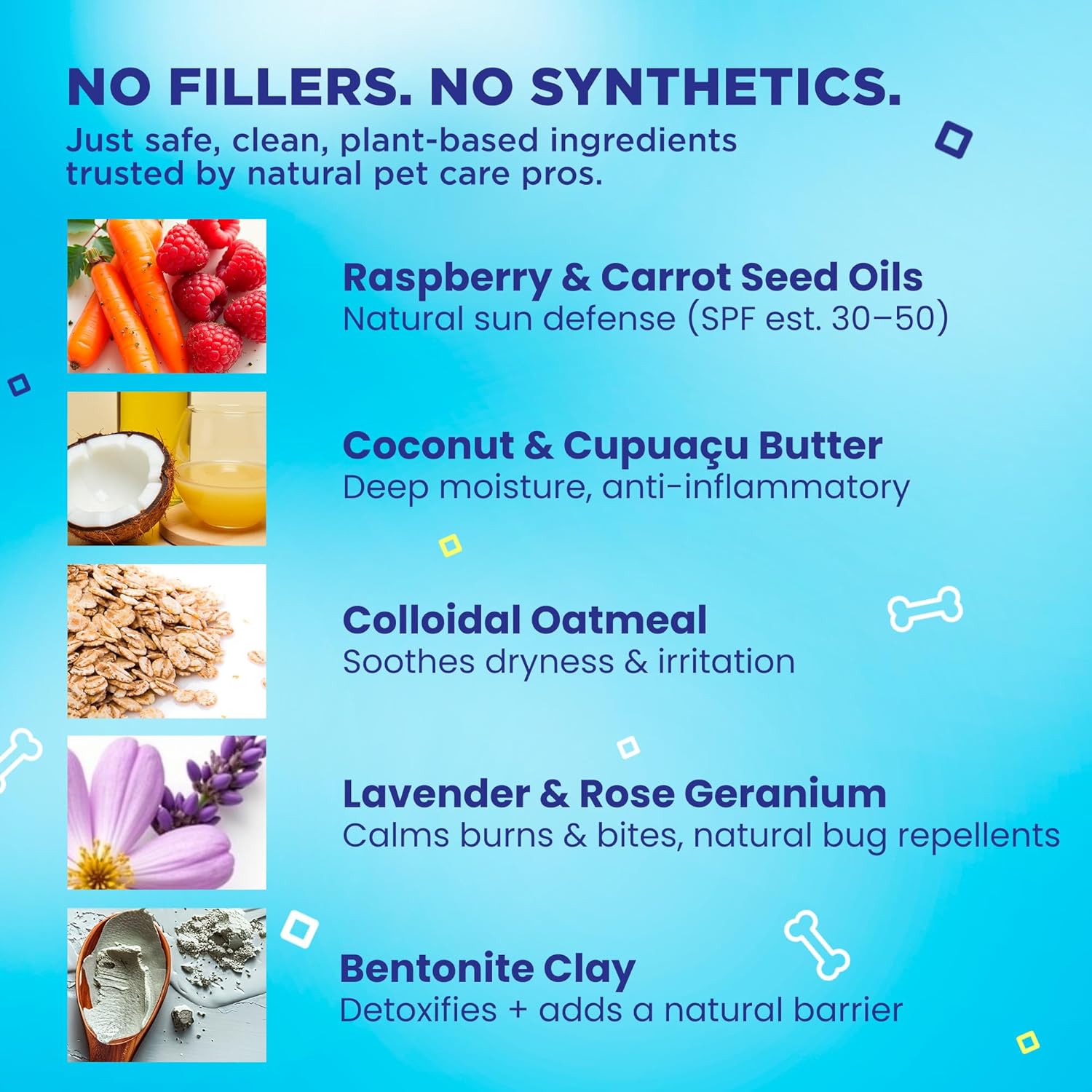 - Sun Protection for Dogs: Year-round protection with dog-safe sunscreen; ideal for dog camping gear and hunting dog accessories; also works as a dog moisturizer for dry skin, skin soother, and paw balm