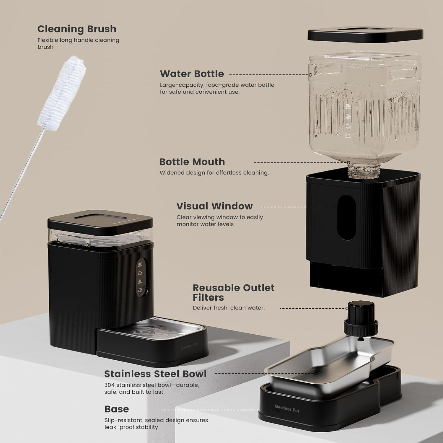 - Premium Pet-Safe Materials - Gardner Pert dog water bowl dispenser comes with 304 stainless steel bowl + cleaning brush guarantees a safe, easy-to-clean water supply for pets.