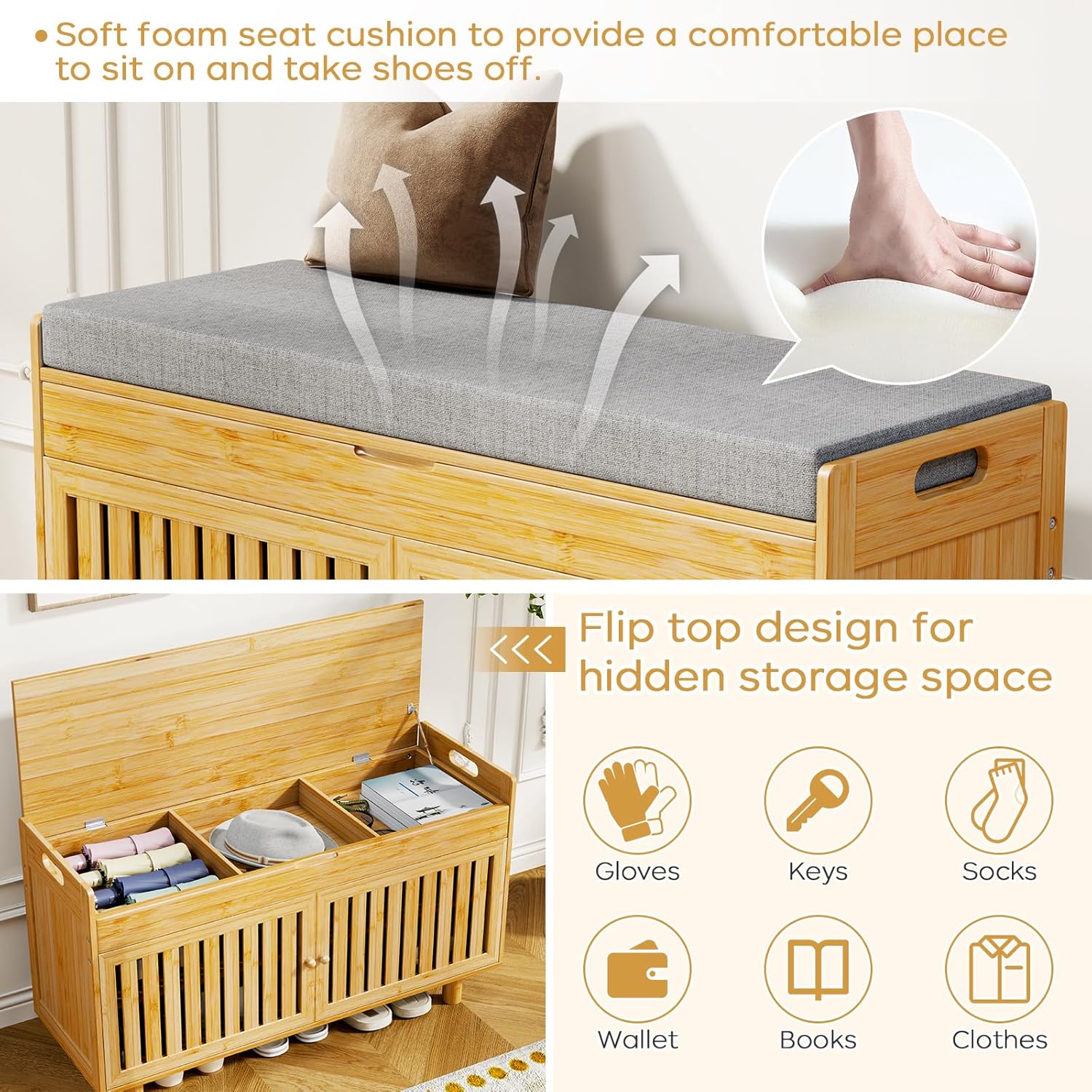 - 【Stylish and Practical】- This coat rack and shoe bench set effortlessly combines practicality and aesthetics, keeping everything organized in one place and reducing unnecessary space occupation. The seat cushion is made of soft sponge and covered with high-quality breathable linen fabric, which is easy to remove and clean, so you can sit comfortably and tie your shoelaces easily. The entrance shoe storage bench provides you with a comfortable and convenient shoe changing experience.