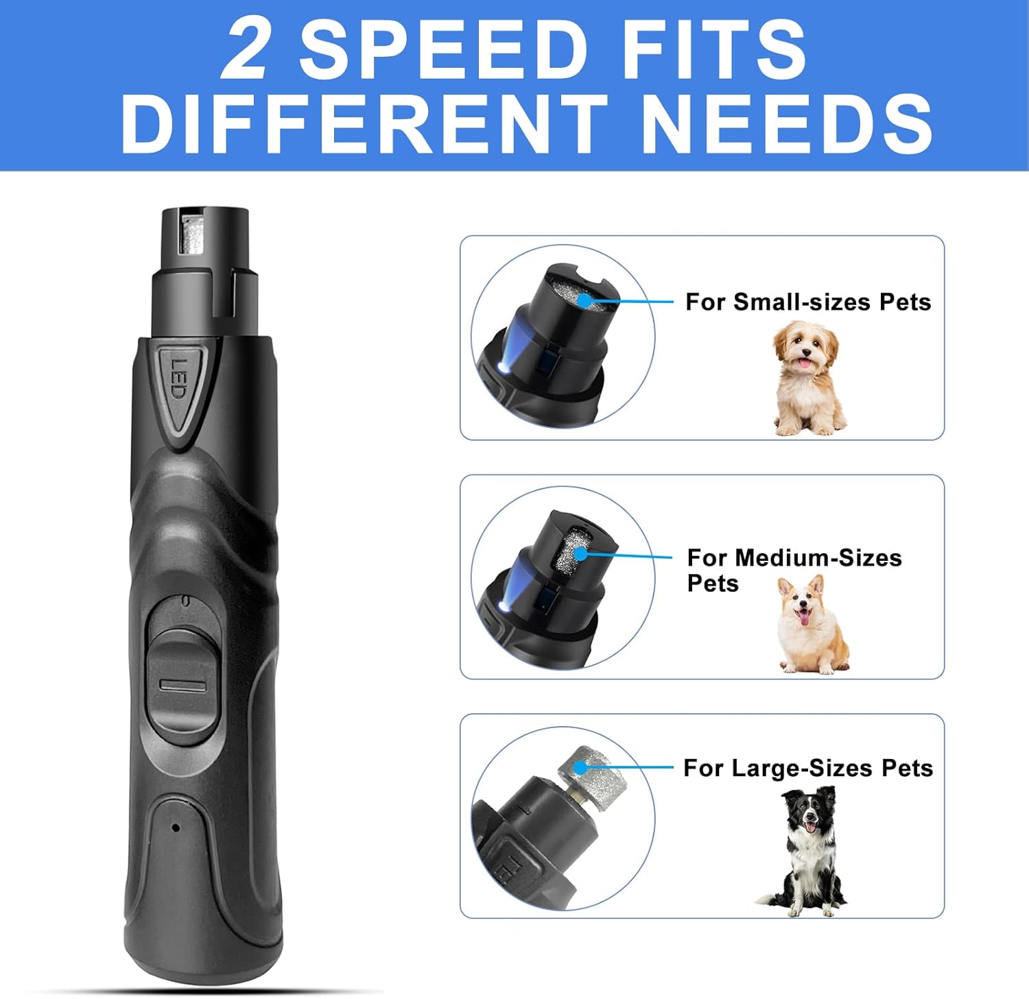 - [LED Display & Dual-Speed Control]Monitor battery status and effortlessly adjust between two optimized speeds using the intuitive LED screen, ensuring safe and effective trimming for pets of all sizes and nail hardness levels.