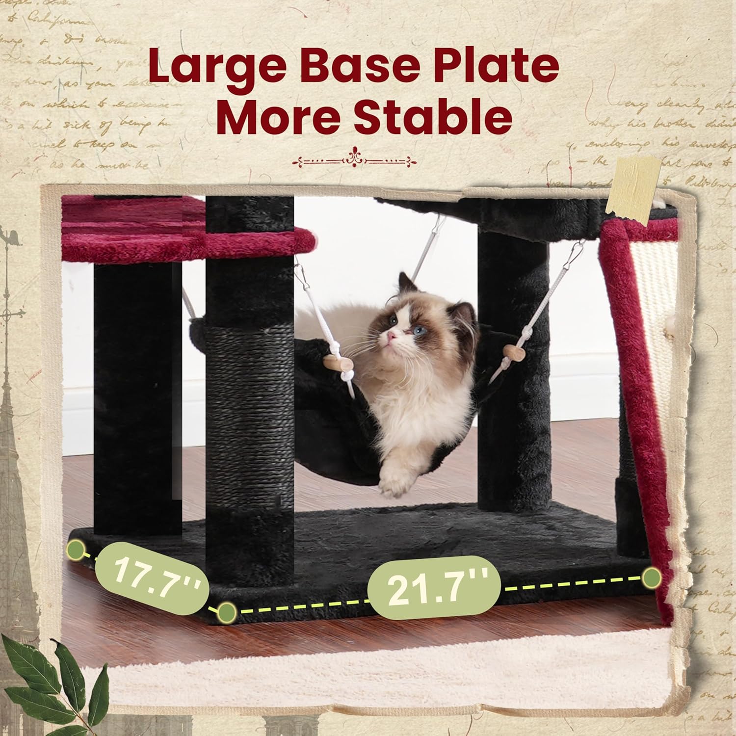 - Large Base, More Sturdy: The spacious base(21.7''L x 17.7''W) provides excellent stability. Additionally, the included anti-tipping straps can be used to secure this cat tree to the wall. Even when adult cats or large cats climb up and down, it is not easy for the cat tree to tip over, making it much safer.