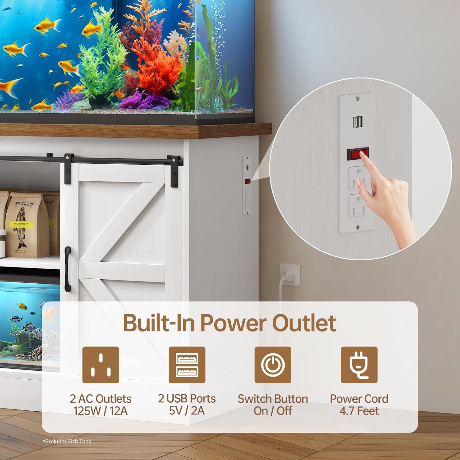 - 【Built-in Power Station】The integrated electrical hub features 2 grounded 120V/15A outlets + 2 smart-charging USB ports with surge protection, plus 4 cable management grommets to safely power filters, heaters and LED lights while maintaining a clutter-free appearance with hidden wiring channels throughout the structure.