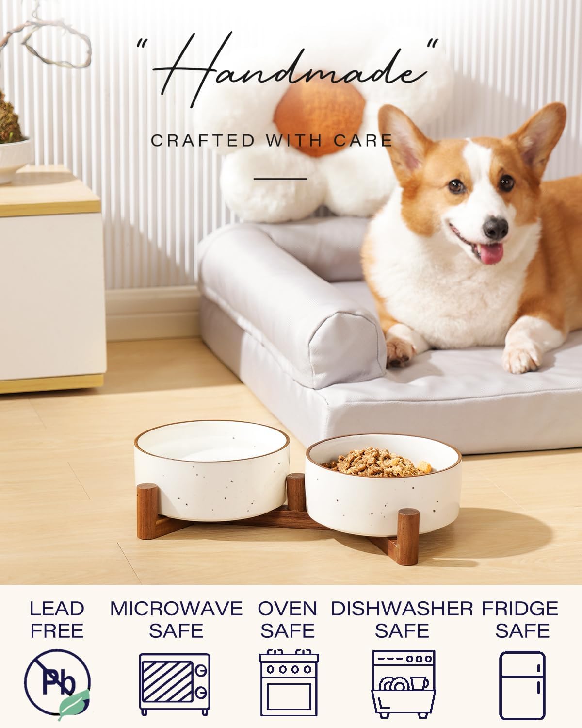 - [Stylish dog food bowl Stand] Stand made of acacia wood provides a stable base for the bowls, also adds a touch of sophistication to your home. Natural grain of the acacia wood complements any home decor and rounded edges designed safe for your cute friend