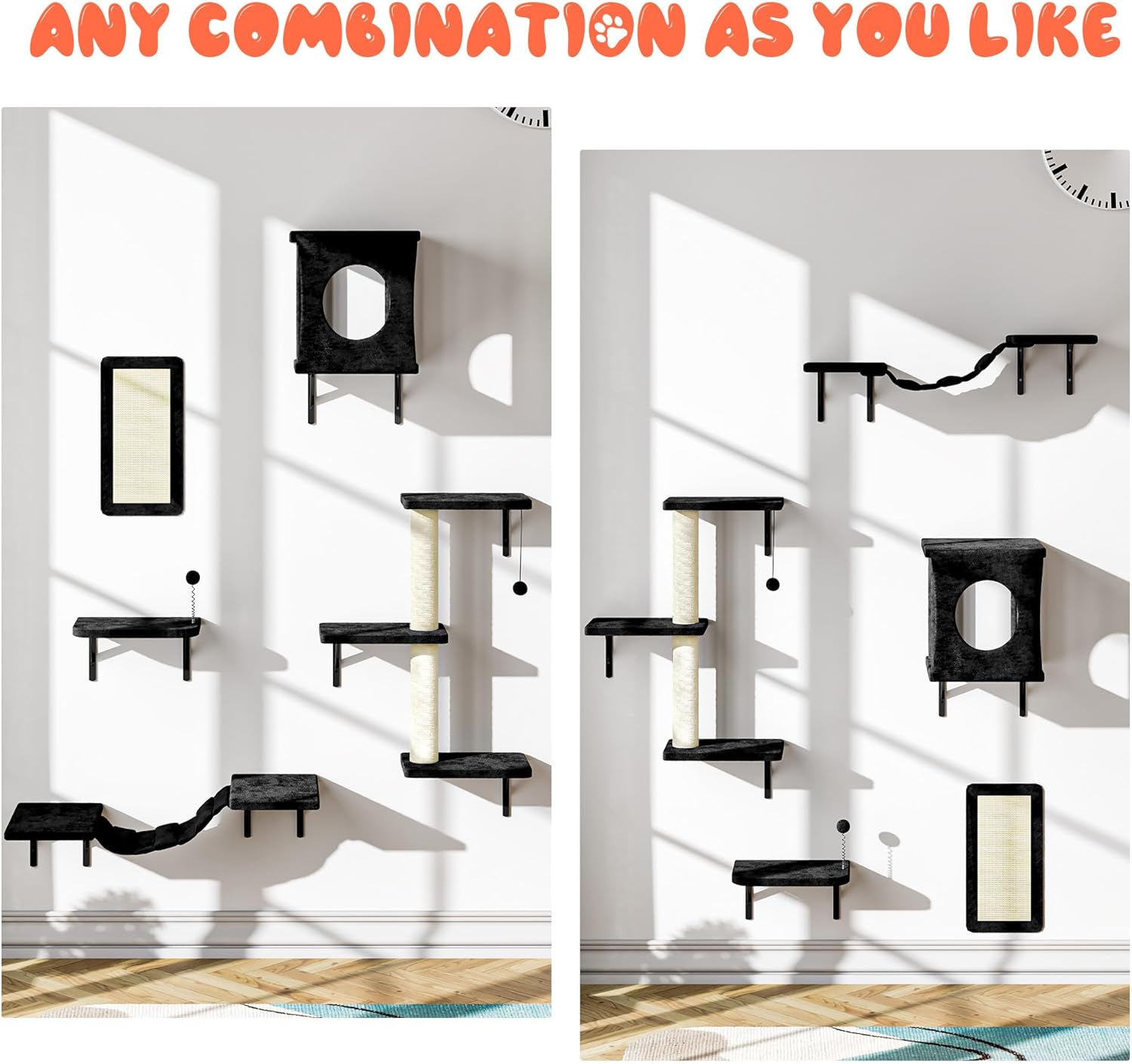 NUNU LAB Cat Wall Shelves Set, 5 Pcs Wall-Mounted Cat Climber with Cat House, Bridge, Scratching Post, Hammock, Wall Shelves, Black