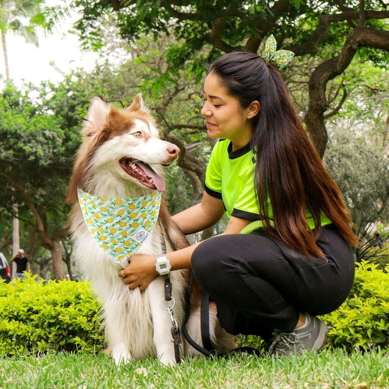 E-Clover Summer Lemon Dog Bandanas & Matching Scrunchie Set Green Stripe Dog Scarf Bibs Pet Bandana with Bow Tie for Medium Large Dogs Owner Mom
