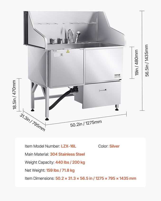 - More Comfortable Grooming: The dog grooming tub is featuring CUPC and bathroom security certification, the hot and cold dual-control faucets and gentle/strong dual water pressure showerhead provide versatility. The 500 ml large-capacity soap dispenser ensures long-lasting use with each refill. The 304 stainless steel tub body is scratching-resistant and corrosion-proof