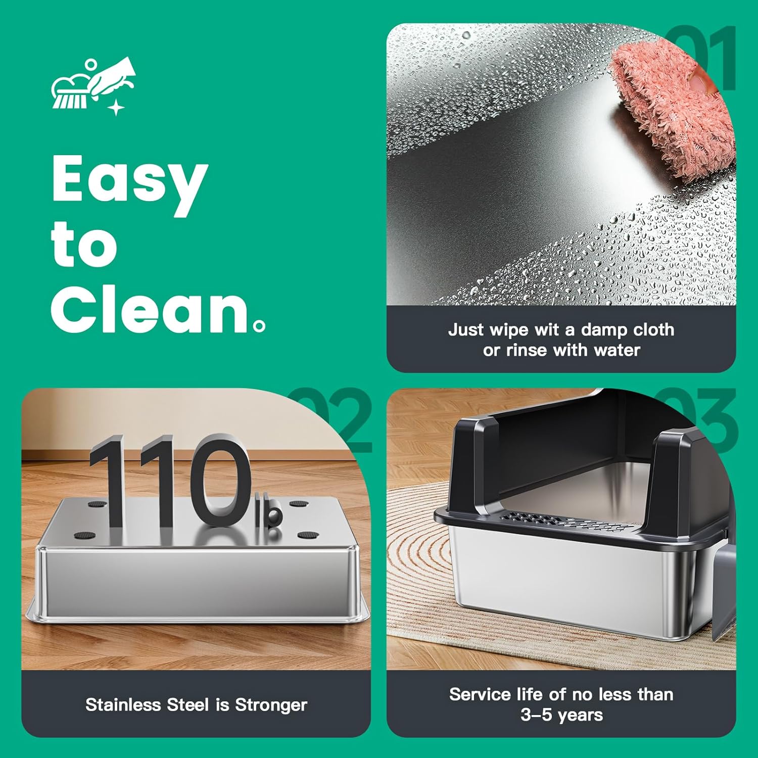 - 【EASY TO CLEAN】The unique metal material of the extra large stainless steel litter box covered is very easy to clean, just use a wet rag or rinse it to get it clean as new
