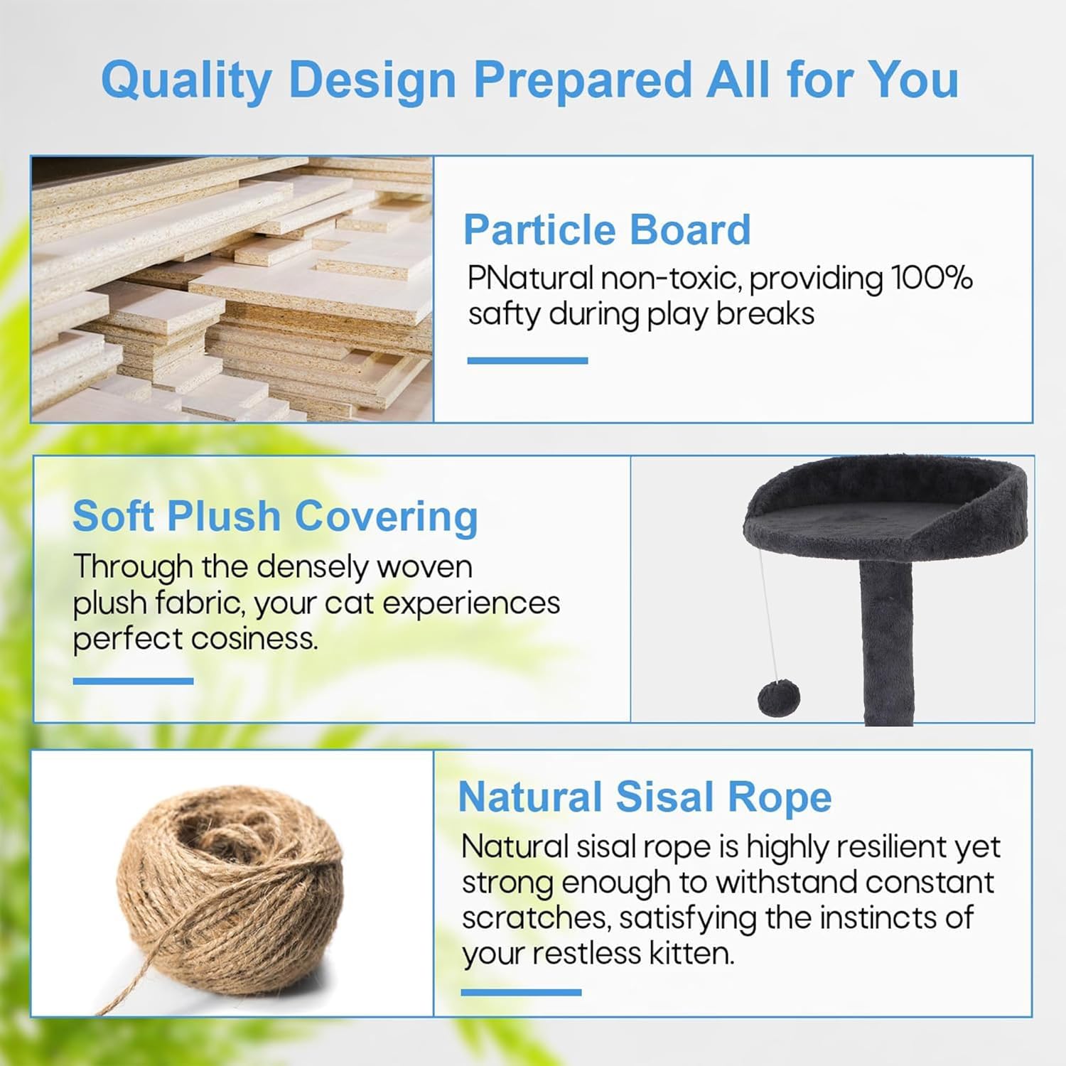 - Material : Engineered Wood, Plush, Sisal