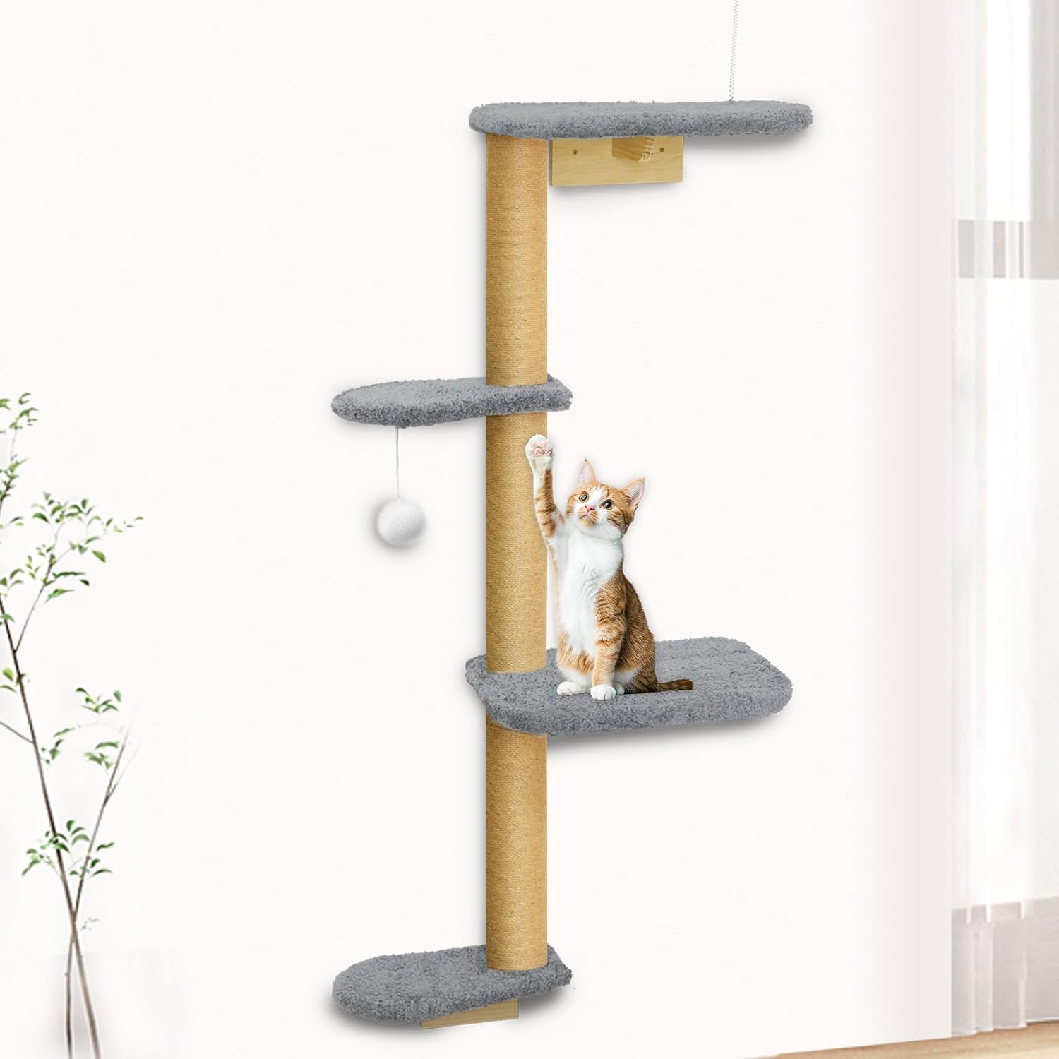 - Fun and Functional Cat Wall Shelves for Kittens: This 4-tier wall mounted cat tree includes 3 climbing posts, 4 staggered platforms, and 2 engaging toys—perfect for cats under 30lbs. It encourages natural climbing, leaping, and scratching behaviors in young or active cats, while giving them cozy spots to rest. Wall-mounted to create a sky playground in your home.