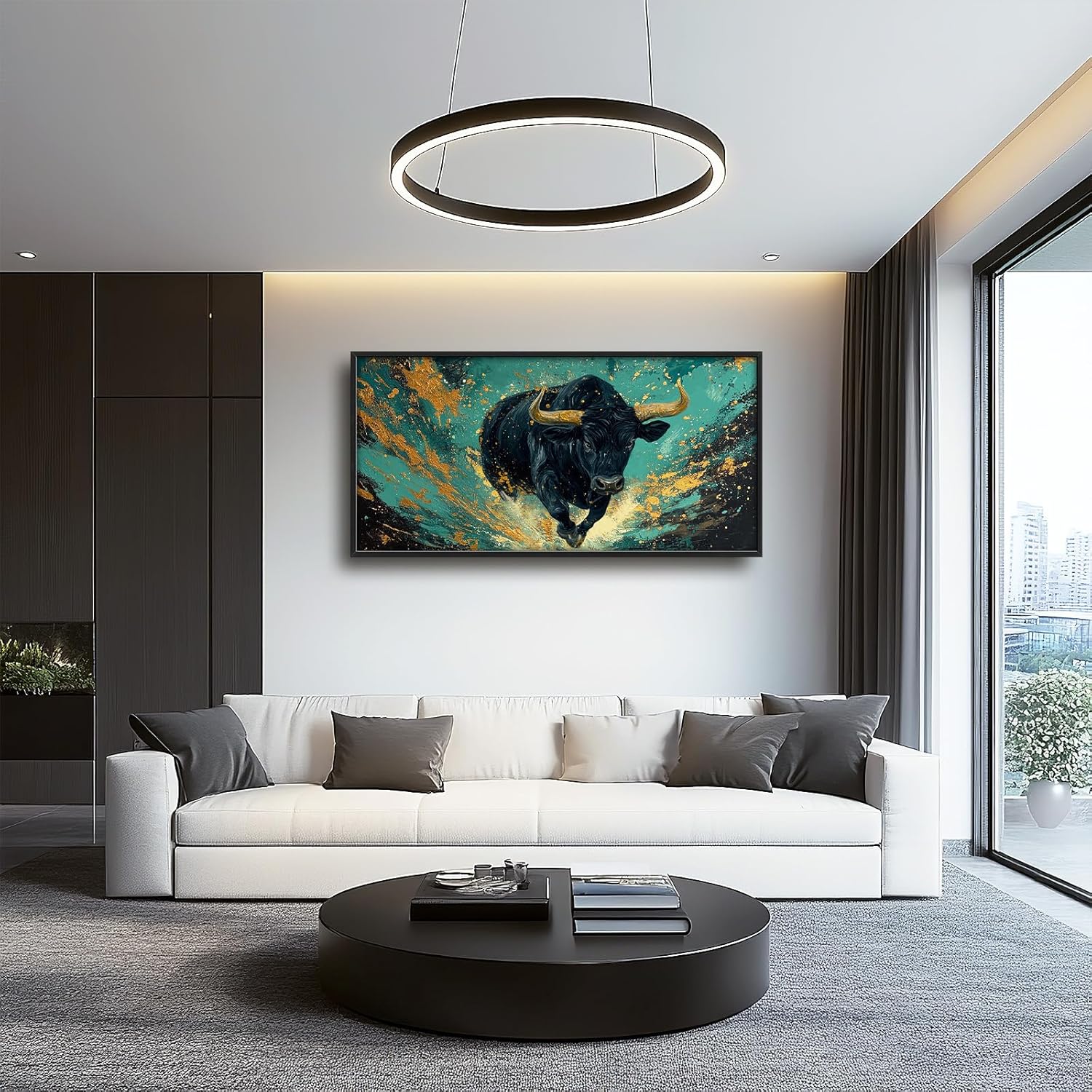 Large Bison Buffalo Wall Art for Living Room, Framed Oversized Bull Wall Decor, Abstract Teal and Golden Canvas Painting Modern Artwork for Living Room Bedroom Office Dining Room 60"x30"