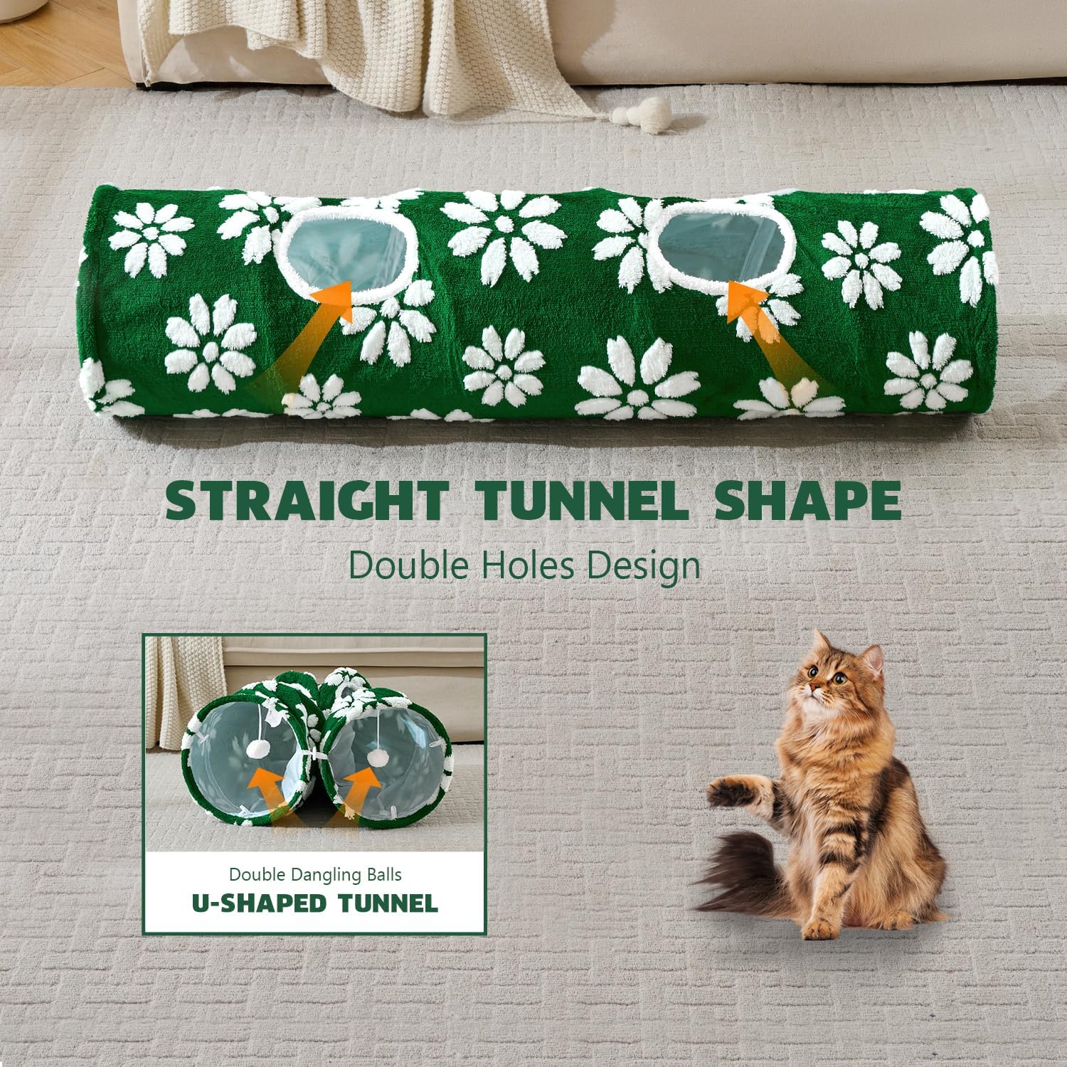 Straight Cat Tunnel for Indoor Cats 47"x12", Cute Cat Toys Collapsible Tunnel Tube with Balls for Puppy Kitten Rabbit, Green Flower