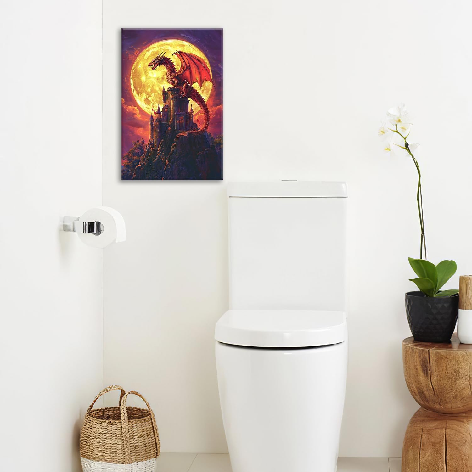 Dragon Bathroom Pictures Wall Art, Red Dragon Castle Bathroom Wall Decor, Framed Painting Canvas Artwork for Bedroom Living Room Decorations 24"L x 16"W