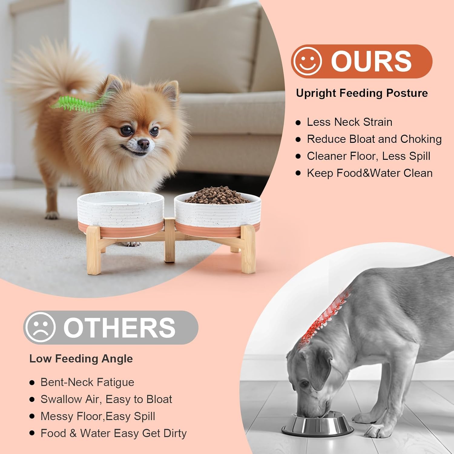 - Four Size Options to Match Any Breed – Choose 5.1" (13.5 oz), 6.1" (28.7 oz), 7.3" (42 oz), or 8.3" (60 oz) capacities with different height adjustable bamboo stand,to fit everything from kitten puppy, small to large sized breed dinners.The generous diameters and smooth ceramic surface handle everything from crunchy kibble and hearty wet food to broth‑soaked raw diets and occasional treats—the versatile pet bowls for every menu