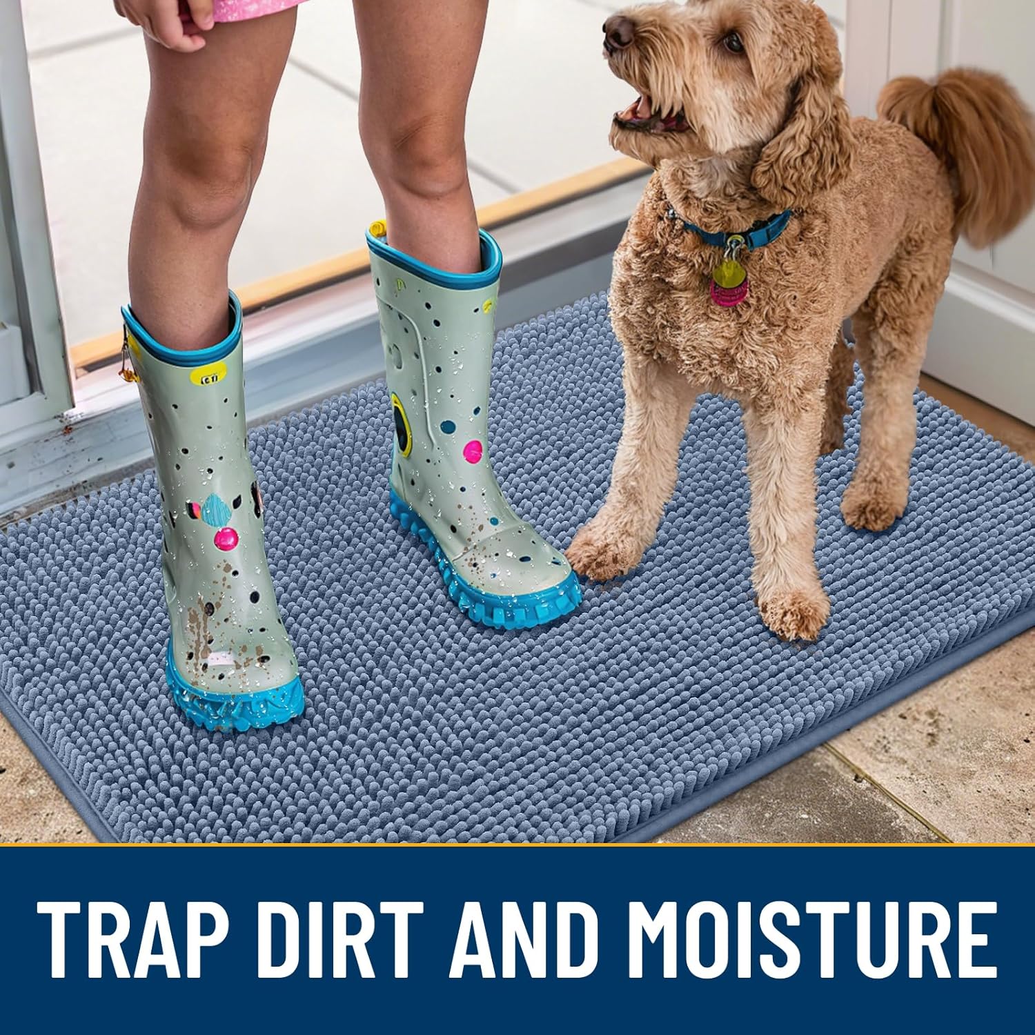 - [Absorbent and Dirt Trapper] High-density chenille dog mat, super absorbent and dirt-catching, whether wet after shower, muddy or moisture bring back by dogs, it can absorb well, so that you and your favorite pet can say goodbye to the wet and mud. It's an excellent choice for use as an entryway door mat, a welcome door mat or a dirt-trapping door mat.