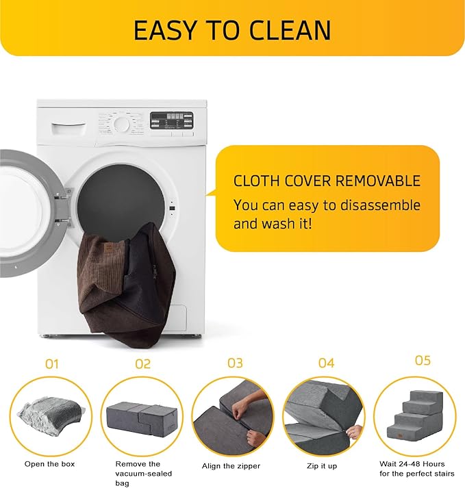 - 【Easy to Clean】: The dog stairs feature a removable, machine washable cover for effortless cleaning. Simply take out the foam core for washing; however, please avoid cleaning the foam and board. After removing from the compression bag, allow 24-48 hours for the foam to fully expand before use for optimal comfort