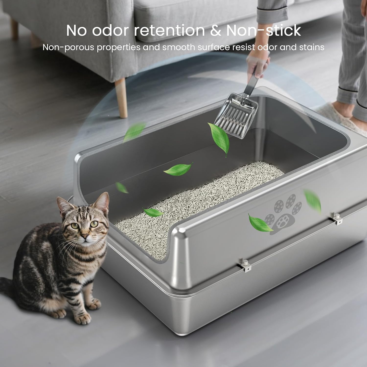 - Doesn't Absorb Odor & Easy to Clean --- The open top stainless steel cat litter box material characteristics will not collect any residue or odor, and the non-stick surface makes cleaning very easy, just a quick rinse and wipe with water to complete the cleaning easily. So if you don't like the characteristics of plastic litter boxes that will retain odor and want an easy way to clean, this stainless steel litter box is a great choice for you!