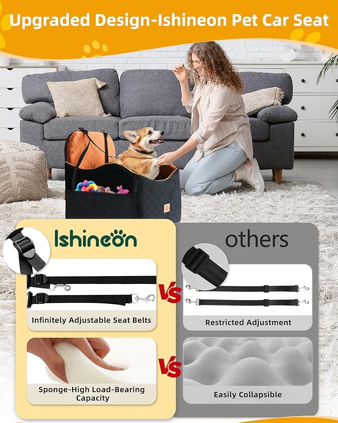 - Premium Dog Car Seat with Enhanced Safety:Upgrade your pet's car travel experience with our adjustable belts that extends up to 23.62" (60 cm). This design keeps your pet firmly in place, preventing accidents and ensuring safety. The elevated 6-inch cushion offers a wider view of the window outside, reducing travel anxiety. Reinforced back strap, headrest straps,and non-slip bottom keep pet car seat stable, ensuring a safe and comfortable journey for your beloved pet.