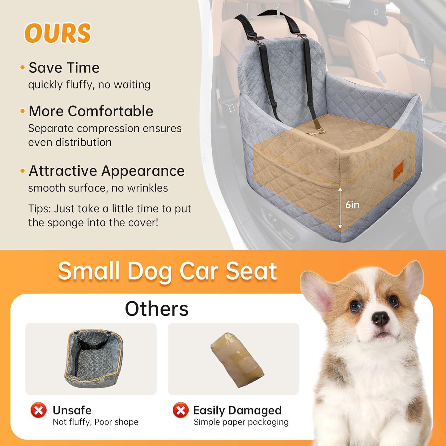 - [Booster Car Seat for Dogs]: Featuring a 6-inch elevated cushion, this pet car seat gives your furry friend a secure and comfortable ride while letting them enjoy a clear view of the outside world. Perfect for reducing travel stress and keeping your pup calm and happy on the go