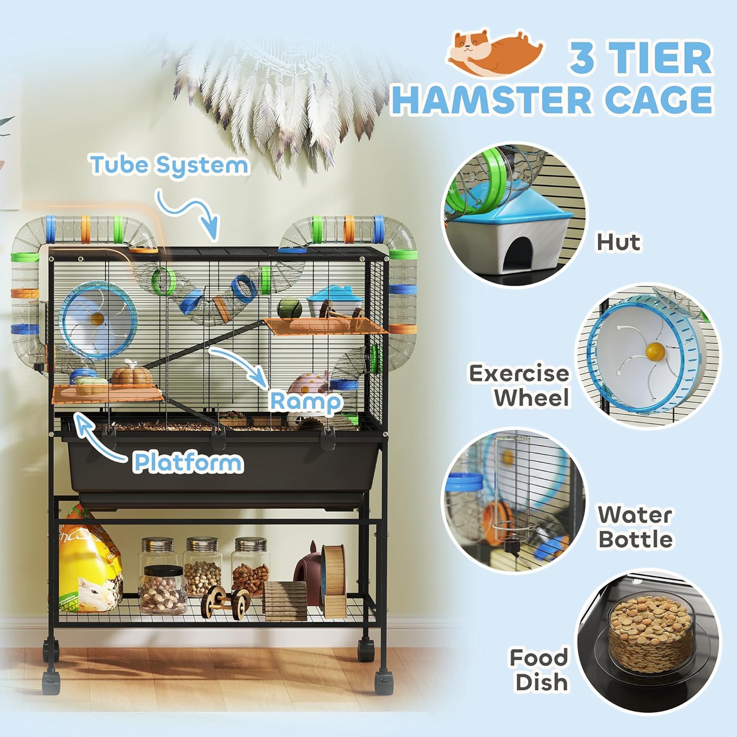 PawHut Hamster Cage with Deep Tray, 3 Tier Rolling Rat Cage with Storage Shelf, Big Exercise Wheel, Tube System, Hut, Platforms, Ramps, Food Dish, Water Bottle, for Syrian, Gerbil, Mouse