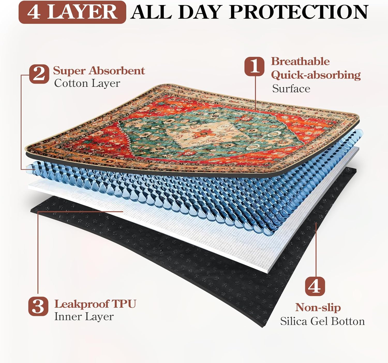 - 4-Layer Protection System: Made of four specialized layers for maximum performance, soft absorbent top layer, quick-drying middle layer, waterproof barrier layer, and non-slip bottom layer. This comprehensive protection system ensures liquids stay contained while the pad remains secure on your floor