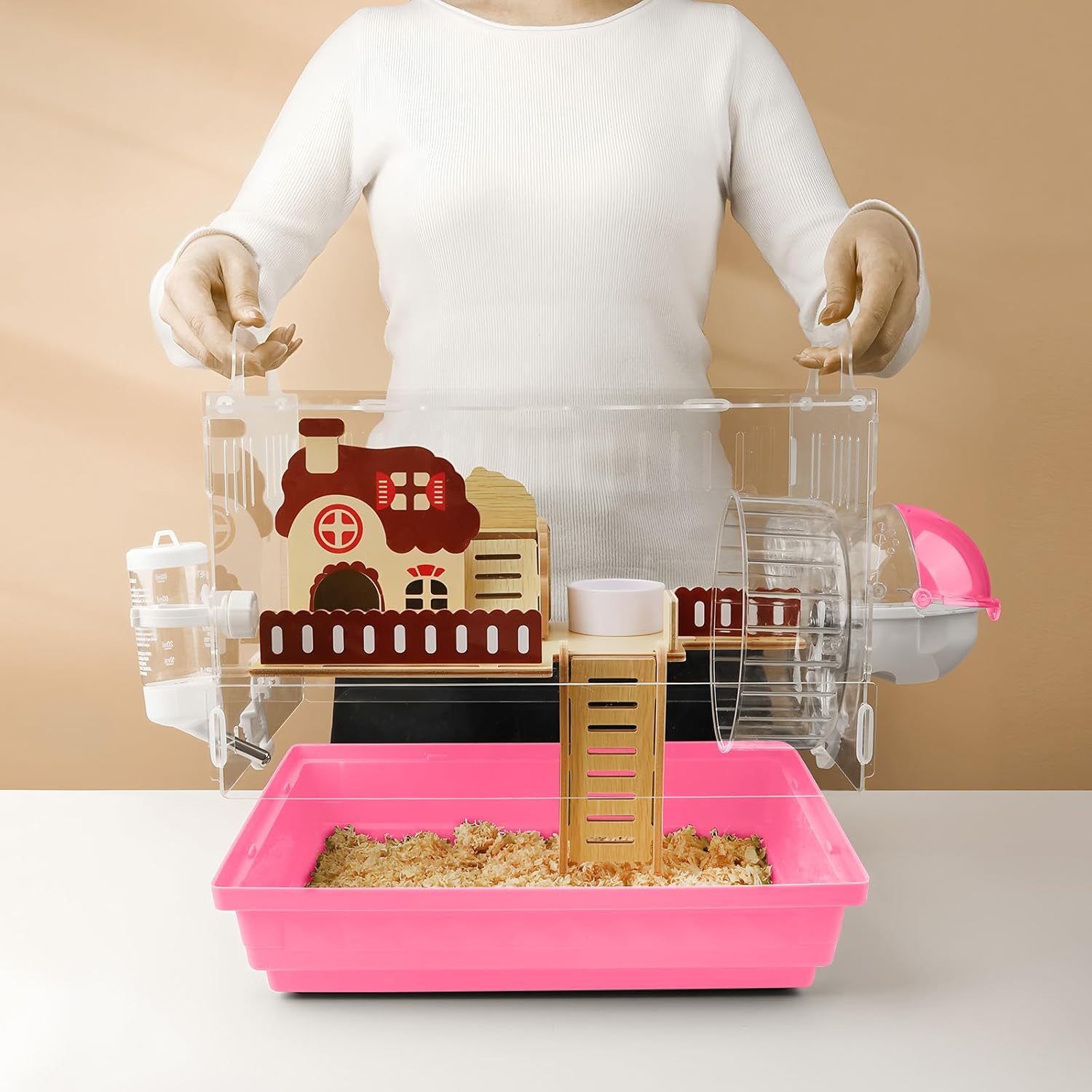 8 in 1 Clear Acrylic Hamster Cage with All Accessories,13.5''L* 10''W* 13''H Dwarf Hamster Cage,Small Hamster Habitat,Garden Style Mouse Cage for Pet Mice,Hamster Enclosure(1-Layer,Pink)