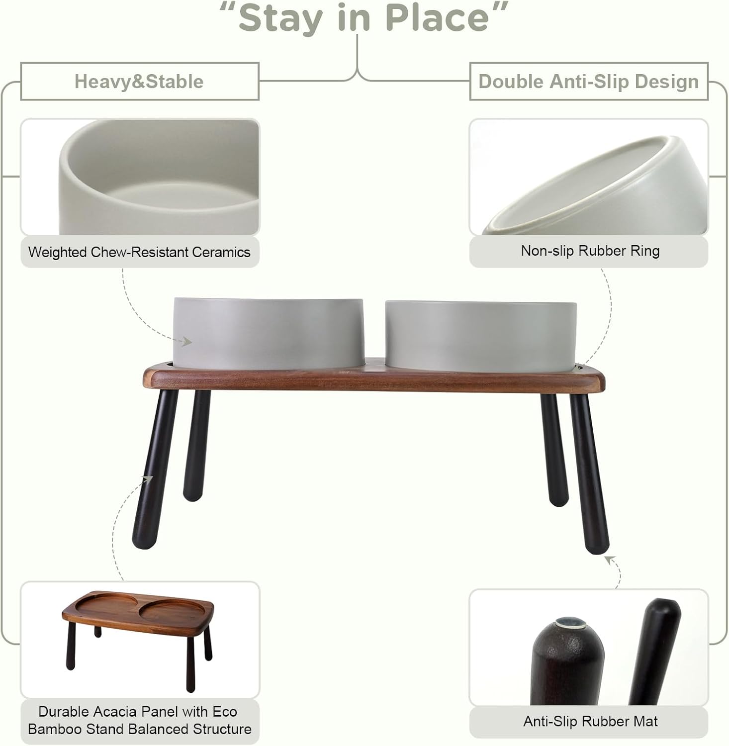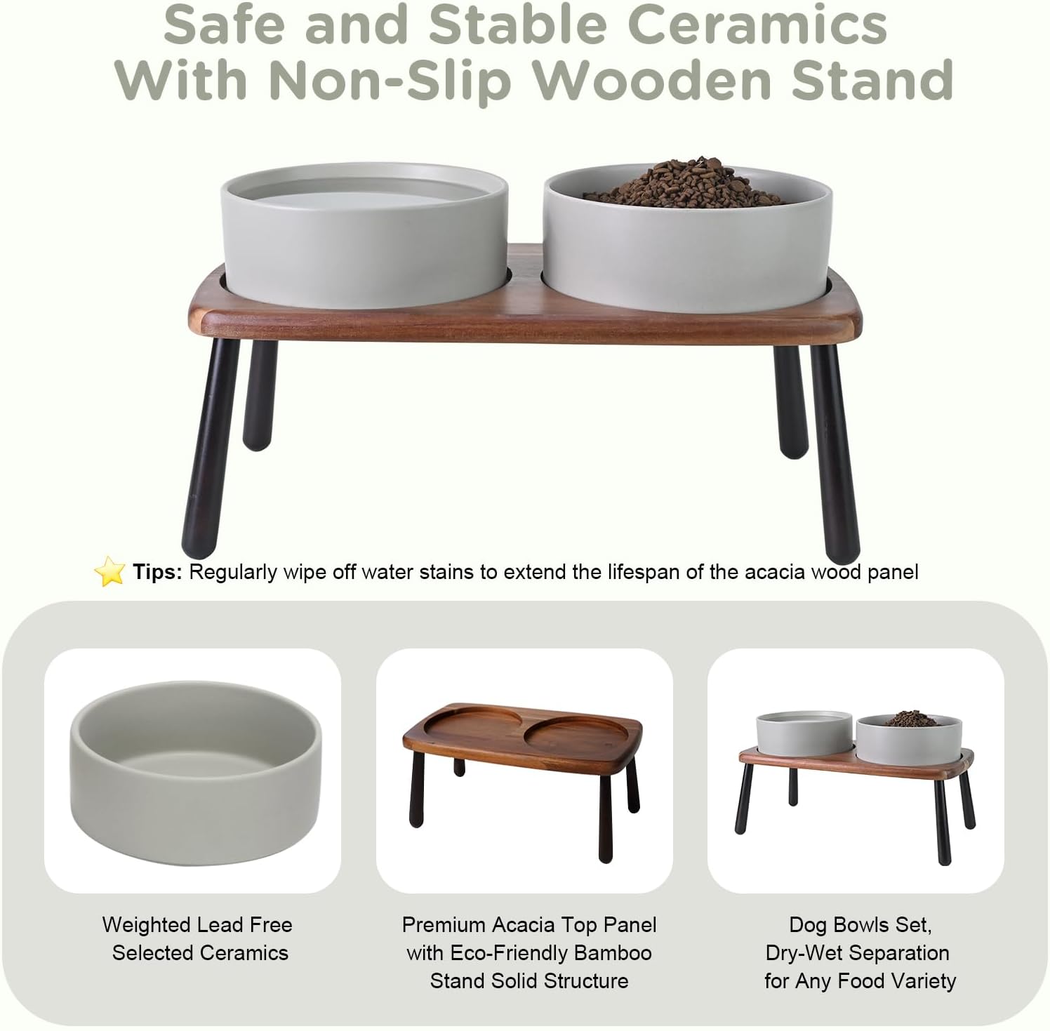 - Stable, Tip‑Resistant Design – A solid acacia wooden panel eco bamboo legs stand with Chew‑Resistant Heavyweight Ceramic, wide stance, and slip‑proof silicone pads join forces to create raised dog bowls that STAY IN PLACE on tile, wood, or laminate. Fewer spills mean cleaner floors and no accidental gouges or scratches or noisy