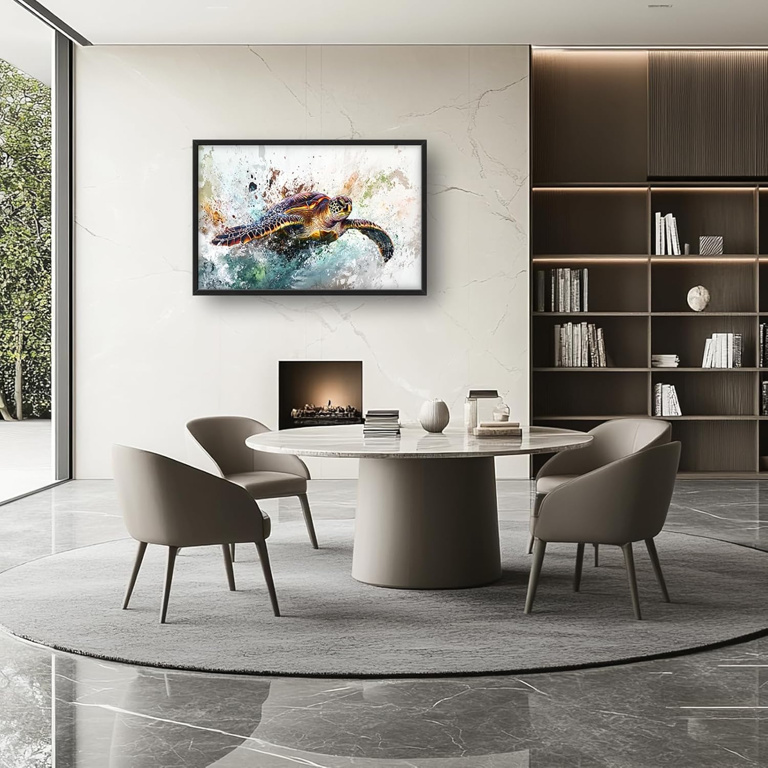 - 【Unique Design】 A colorful sea turtle gliding through the sea water, depicted in an artistic style with splashes of color and brush strokes on white background.
