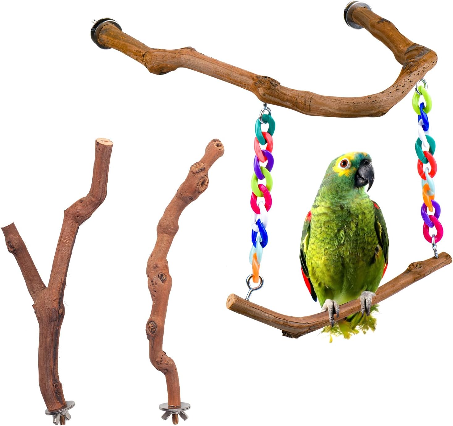 Bird Swing Toys, Standing Bird Perch with Natural Grape Wood, U Shape Hangable Birdcage Accessories, Birds Chewing Toy for Budgerigars, Parakeets, Cockatiels, Conures, Lovebirds, Finches (3Pack)