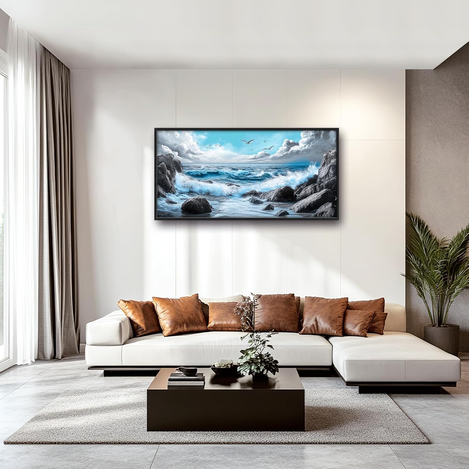 - 【Unique Design】 A stunning ocean scene with crashing waves, rocks, and seagulls in the sky. The blue sea, white clouds, rocks, seashore, sea foam, seashells, waves splashing on the shore, and a blue sky create a breathtaking landscape. The black rocks and stones contrast with the blue waves and water, resulting in a serene and captivating scene.