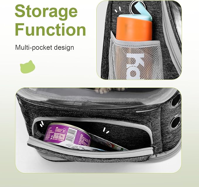 - Multi-Pocket Design: Our pet carrier backpack offers plenty of storage options for your convenience. With side pockets and hook holes, you can easily carry essentials such as treats, toys, and water bottles for your pets. The multi-pocket design allows you to organize your belongings efficiently, making outdoor adventures and trips more enjoyable.