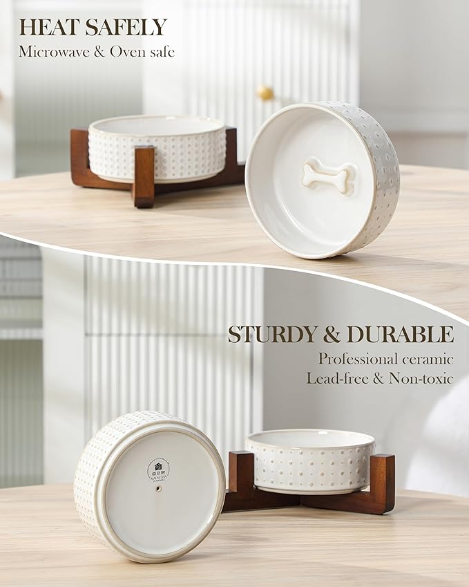 - 🦴【ELEGANT DESIGN】Featuring embossed Rhombic and Polka Dots patterns, paired with a stylish walnut wood stand for elevated dining. These ceramic dog bowls combines classic and modern styles to enhance its visual appeal. The cleverly designed dog bone-shaped decoration at the bottom adds both beauty and fun.