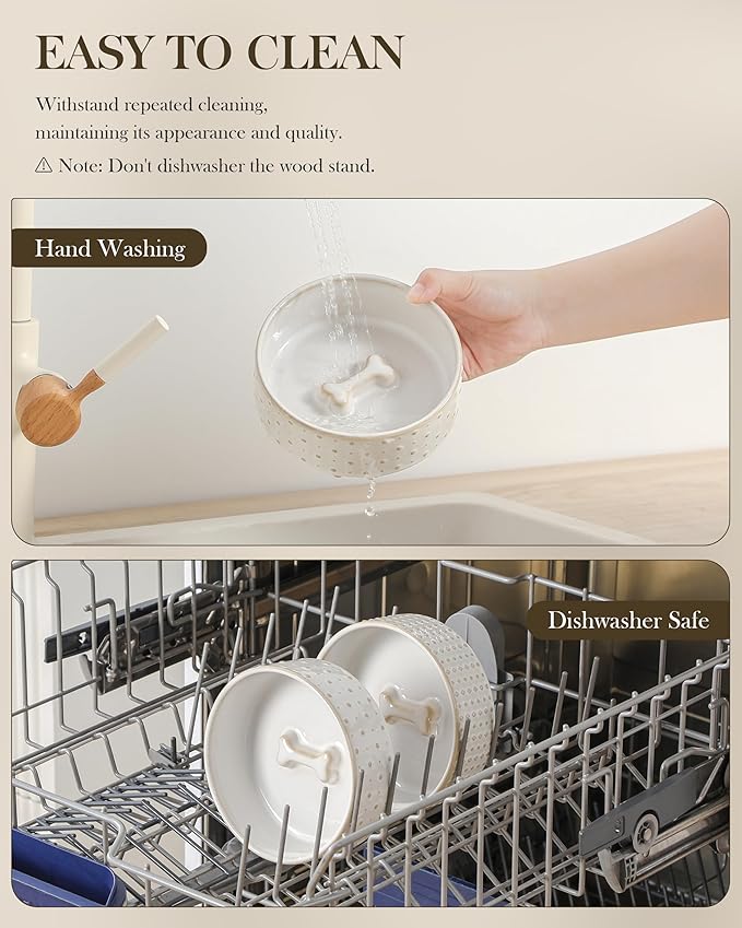 - 🦴【EASY MAINTENANCE】The ceramic bowls can be easily removed from the wooden stand for quick cleaning and convenient refilling. Featuring an active glaze finish, they are dishwasher safe and easy to clean by hand. Microwave safe as well, these bowls allow you to warm up your pet's food whenever needed.