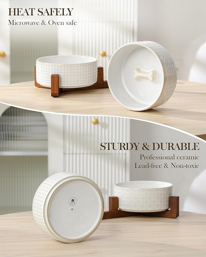 - 🦴【ELEGANT DESIGN】Featuring embossed Rhombic and Polka Dots patterns, paired with a stylish walnut wood stand for elevated dining. These ceramic dog bowls combines classic and modern styles to enhance its visual appeal. The cleverly designed dog bone-shaped decoration at the bottom adds both beauty and fun.
