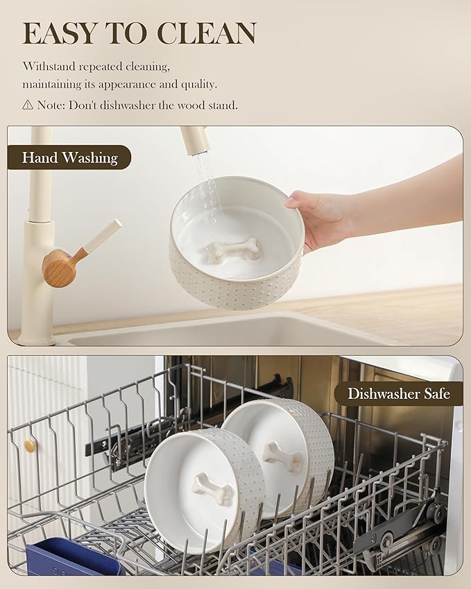 - 🦴【EASY MAINTENANCE】The ceramic bowls can be easily removed from the wooden stand for quick cleaning and convenient refilling. Featuring an active glaze finish, they are dishwasher safe and easy to clean by hand. Microwave safe as well, these bowls allow you to warm up your pet's food whenever needed.