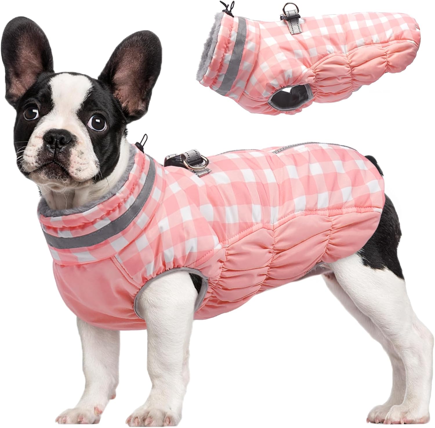 FUAMEY Dog Coat for Medium Dogs,Waterproof Dog Winter Jacket with Harness Built in Puppy Cold Weather Coats Reflective Pet Vest with Zipper Warm Fleece Dogs Snowsuit Windproof Pink Plaid M