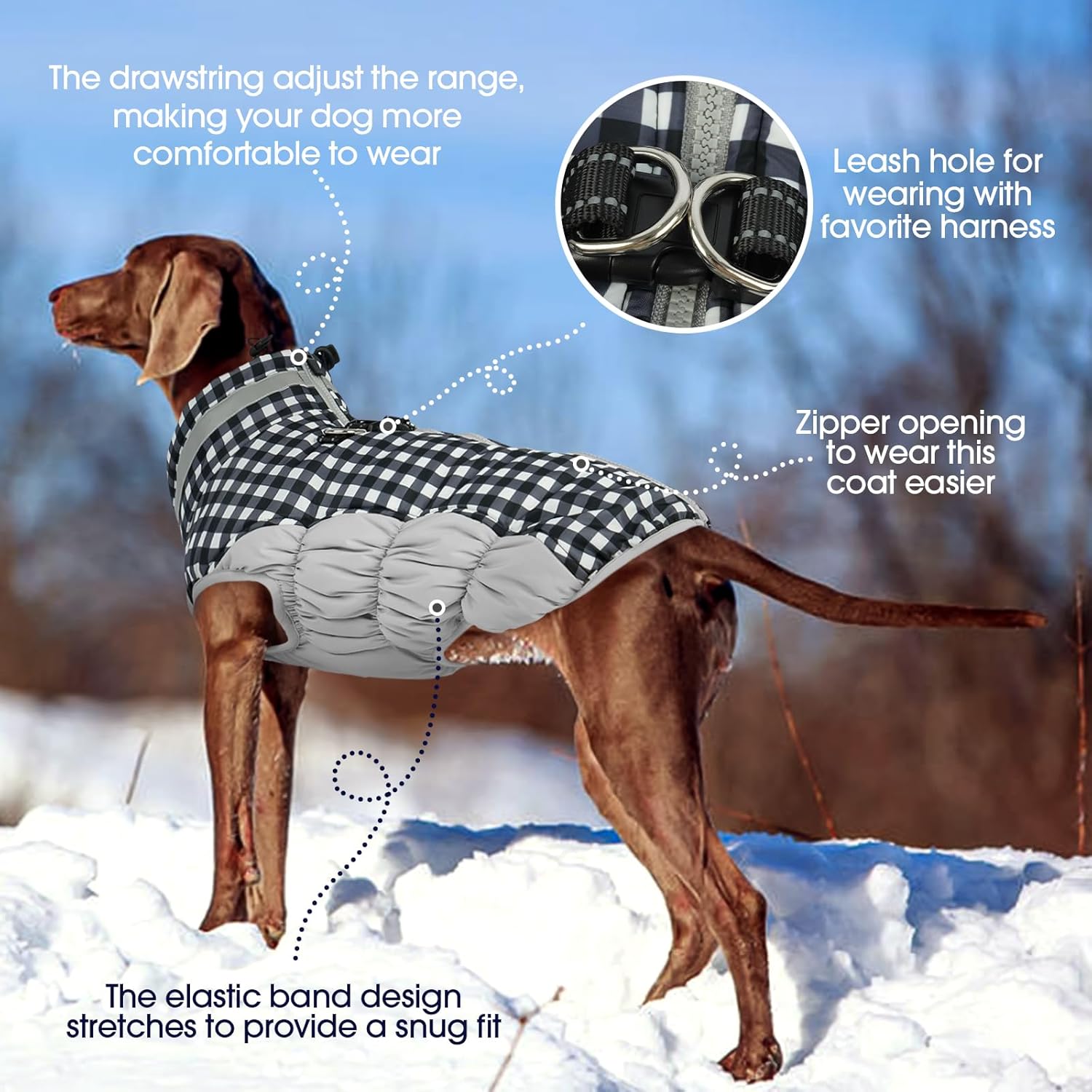 FUAMEY Dog Coat for Large Dogs,Waterproof Dog Winter Jacket with Harness Built in Puppy Cold Weather Coats Reflective Pet Vest with Zipper Warm Fleece Dogs Snowsuit Windproof Checkerboard XL