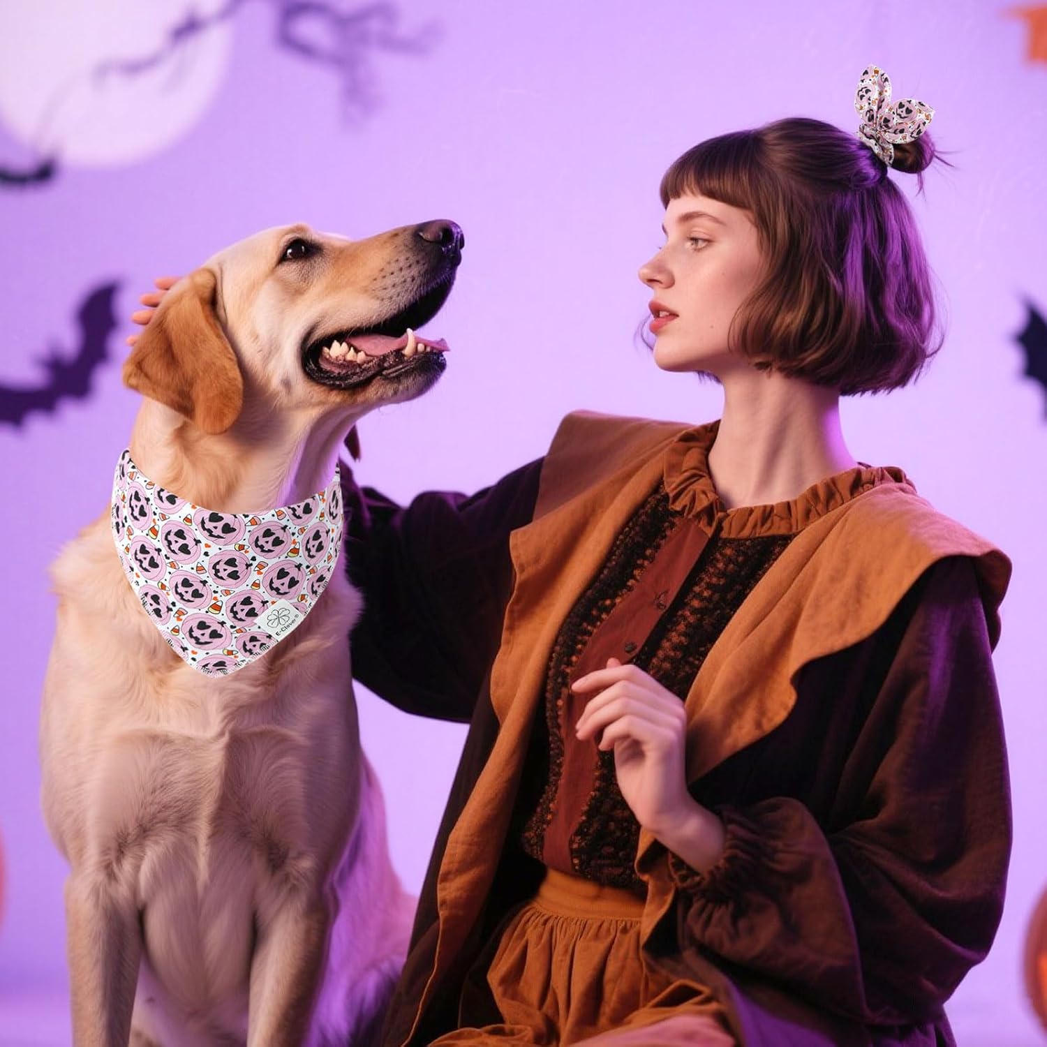 - Matching Bandana and Scrunchie Set: When your pet is wearing a pink handkerchief and you are wearing a bow headband, it's very fun for you to cause trouble and ask for candy together on Halloween! When traveling, sleeping, taking photos or daily warking, adorable fall dog bandana and scrunchie is a pretty accessories.The the hair tie can be worn as a wrist accessory and hold your hair.