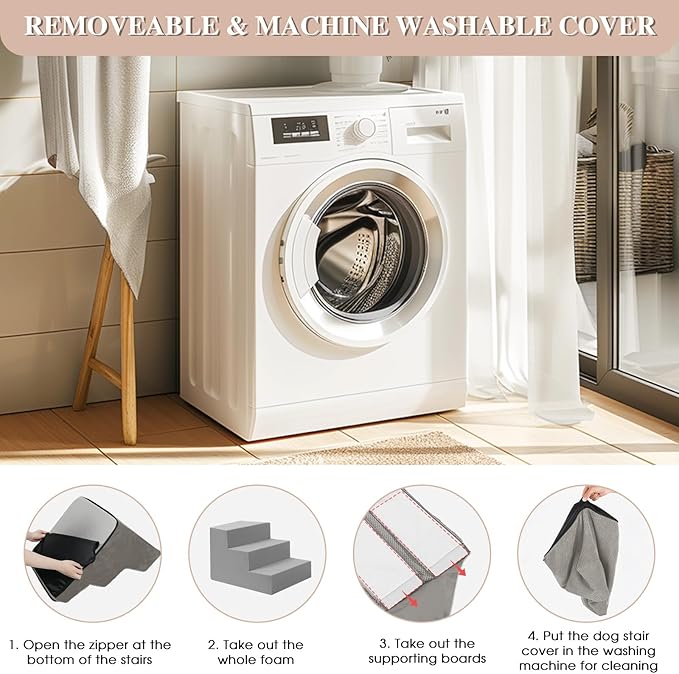 - 【EASY TO CLEAN】 When used for the first time, no assembly is required. After opening the package, allow 48 hours for the stairs foam to rebound. When clean it, just take out the foam and supporting boards. The removable cover is machine washed. Please do not wash the foam to retain shape and support.