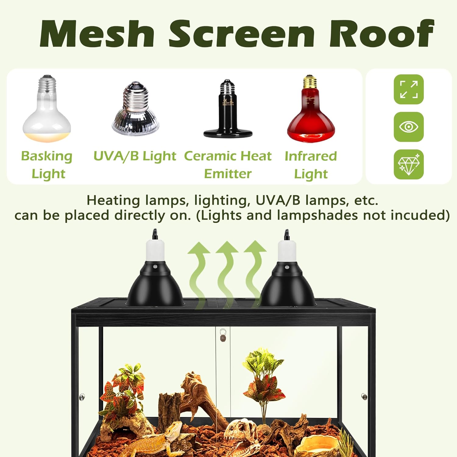 - 【Smart Design for Comfort & Security】The front features double sliding glass doors with a secure lock for easy access and peace of mind. A sturdy metal mesh top ensures proper ventilation and is compatible with heat lamps or UVA/UVB lighting setups (not included), helping maintain the perfect conditions for your reptiles.