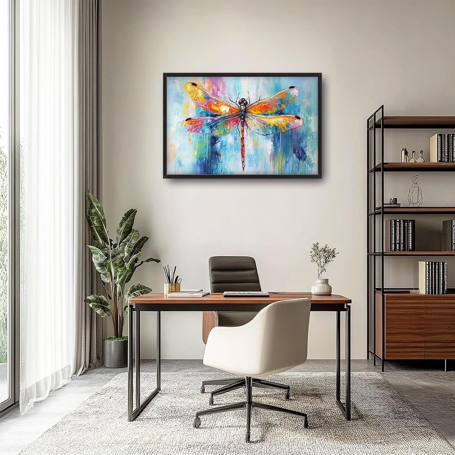 - 【Unique Design】 Colorful dragonfly painting, with vibrant colors and a colorful background, created using oil paint and detailed brush strokes. The large wings of the dragonfly are spread out, showcasing the bright colors.
