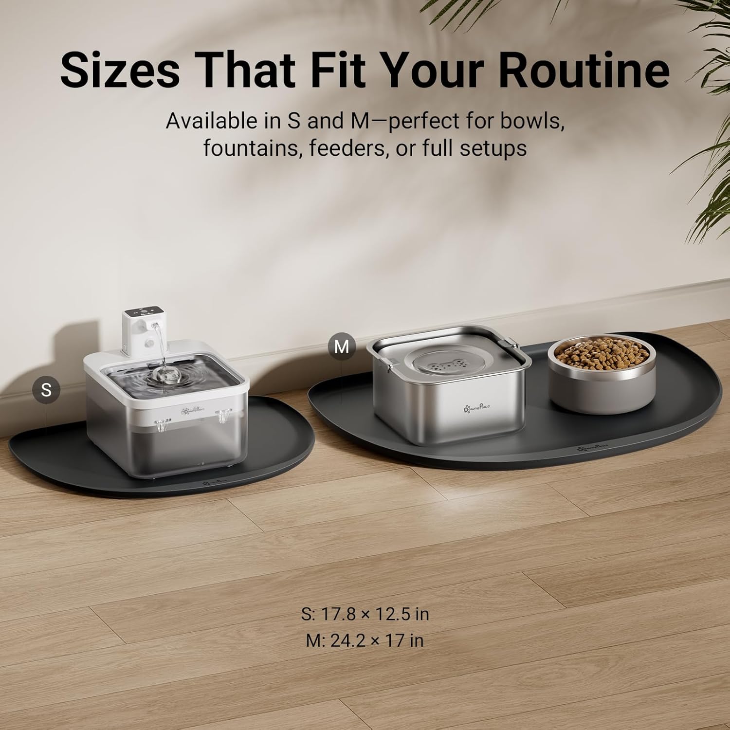 - Available in Two Sizes: Choose from two size options to suit your space and feeding setup. Sized to fit DownyPaws fountains or dog water bowl perfectly, while also compatible with most pet food and water bowls or feeder. (S: 17.8×12.5×0.6 in, M: 24.2×17×0.8 in)