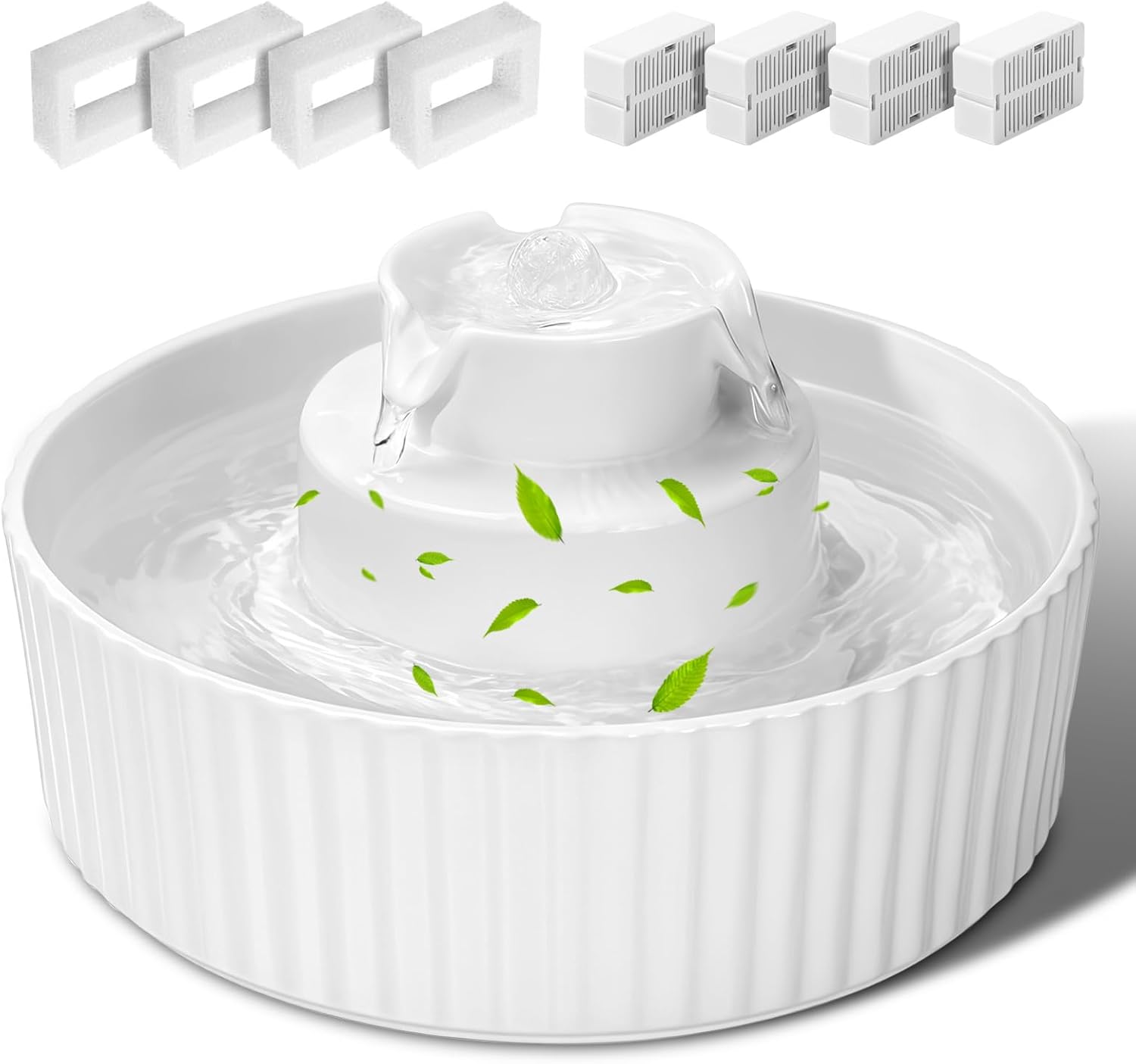 Ceramic Cat Water Fountain, 2.1L/70oz Porcelain Pet Drinking Dispenser with 4 Set Replacement Filter & Sponge, Automatic Dog Water Bowl with Ultra-Quiet Pump, Cat Feeding Watering Supplies(White)