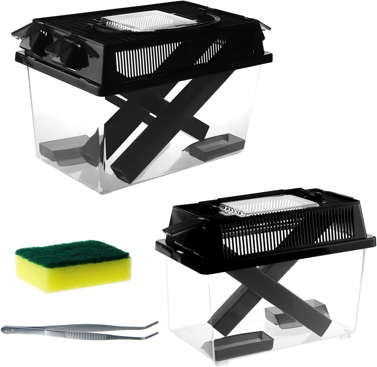 - 【Complete cricket care kit】1 x Large cricket keeper, 1 x medium cricket keeper (Equipped with 2pcs dark dispenser tubes, food dish and water bowl); 1 x tweezer; 1 x Sponge brush.