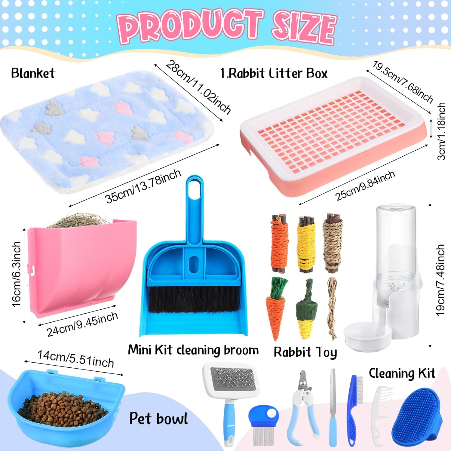 - Comprehensive PET Care Kit: the rabbit starter kit is designed to meet all your pet care needs, including 19 items, 1 rabbit litter box about 25 x 19.5 x 3 cm, 1 white strawberry bear pet blanket about 13.78 x 11.02 inches, 1 pair of small pet nail clippers and files, 1 animal grooming kit, 6 fun rabbit toys and 1 small pet bowl and 1 hanging automatic food and water dispenser, 1 small animal external grass stand, all tools are carefully designed to provide comfort and enjoyment for pets