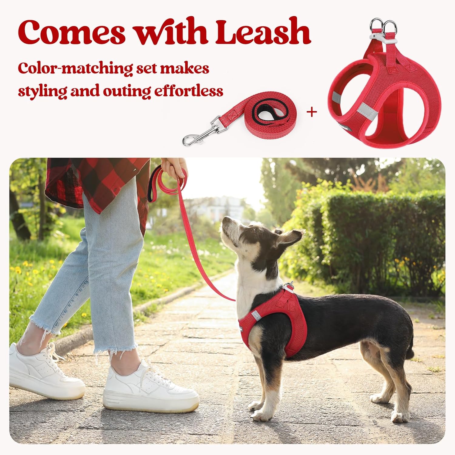 - Dog Harness with Leash Set:The color-matching harness and leash with reflective bands make it fashion and visible for pet outing. The leash is 5.15ft in length, with an anti-tangling clip and a palm-friendly handle