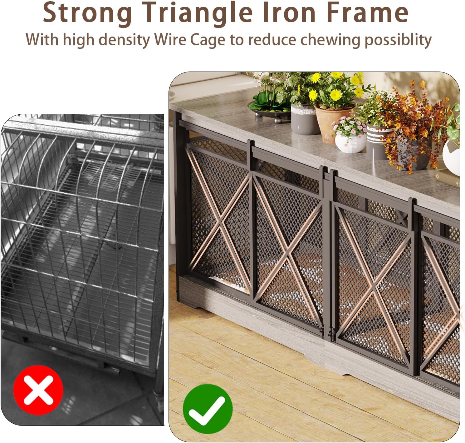- 🐾【Chew-Resistant & Sturdy】 This dog crate furniture is built with heavy-duty metal and premium wood, featuring a excellent quality metal coating for safety. The reinforced wood-iron structure enhances chew resistance while providing comfort, durability, and easy maintenance. The bottom wooden board offers stable support, protecting your pet’s paws from injury.