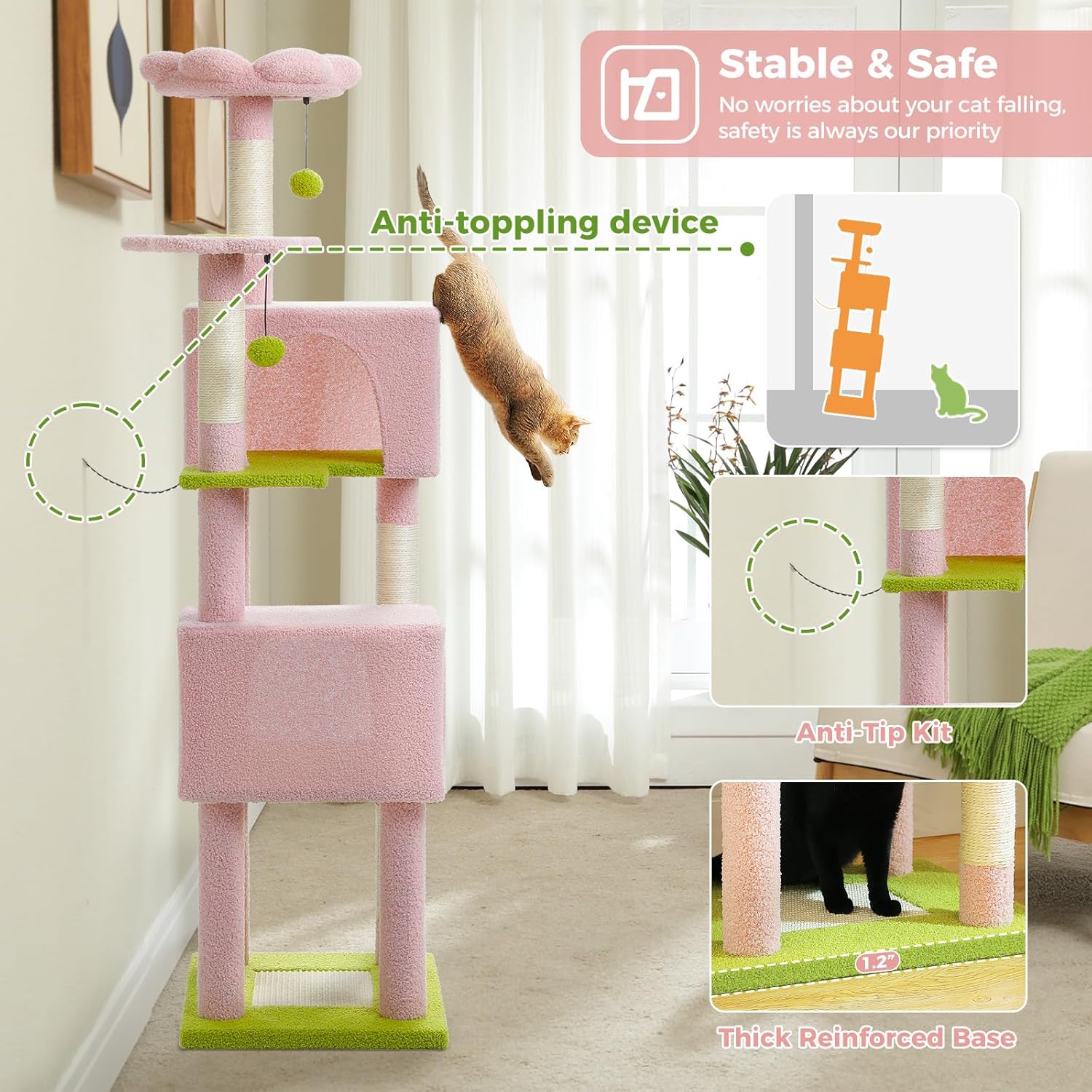 Flower Cat Tree, 62-Inch Large Cat Tower for Multi-Cat Households w/Scratching Posts, Multi-Level Cat Condo w/Cozy Top Perch & Scratching Pad, Padded Platform, 2 Pompoms, Pink