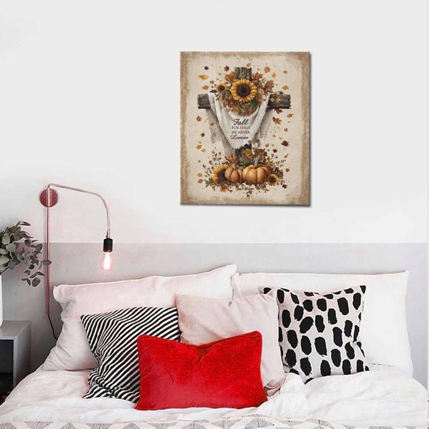 Christian Fall Wall Art Autumn Rustic Cross Sunflower Pumpkin Wall Decor Fall for Jesus He Never Leaves Pictures Painting Print Framed Artwork Decorations Gifts for Living Room Bedroom Prayer Room Office 20"x24"