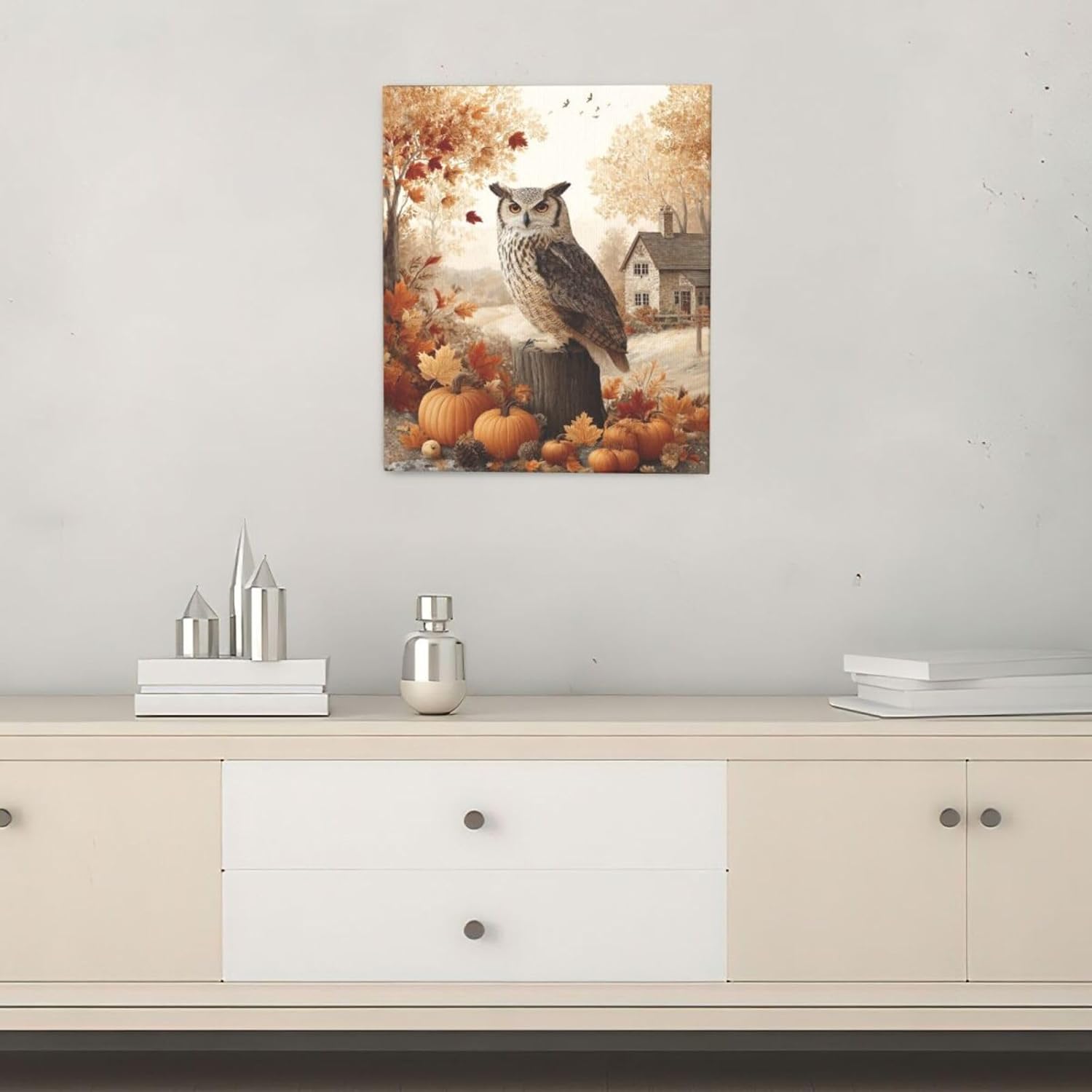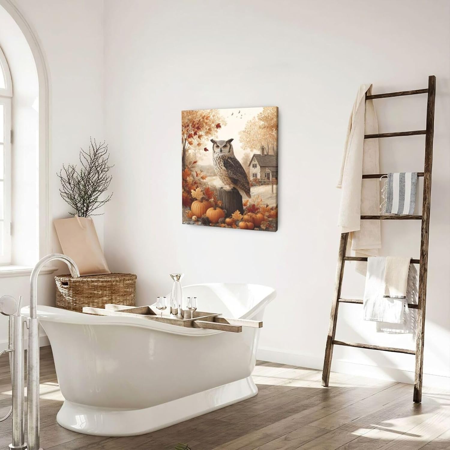 Fall Owl Wall Art Autumn Pumpkin Leaves Wall Decor Rustic Canvas Print Farmhouse Pictures Painting Print Framed Artwork Decorations Gifts for Living Room Bathroom Bedroom Office 20"x24"