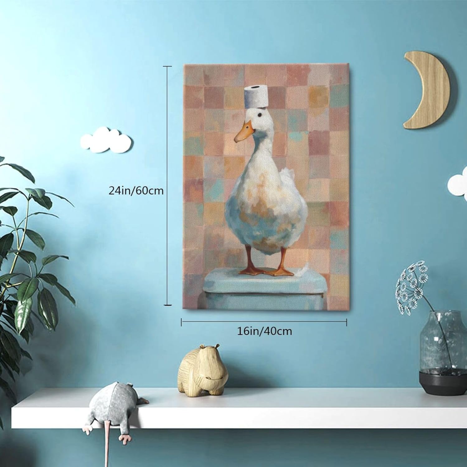 Funny Duck Bathroom Wall Art Cute Duck on Toilet Canvas Wall Decor Funny Quirky Farm Animal Pictures Painting Print Framed Artwork Decorations Gifts for Bathroom 16"x24"